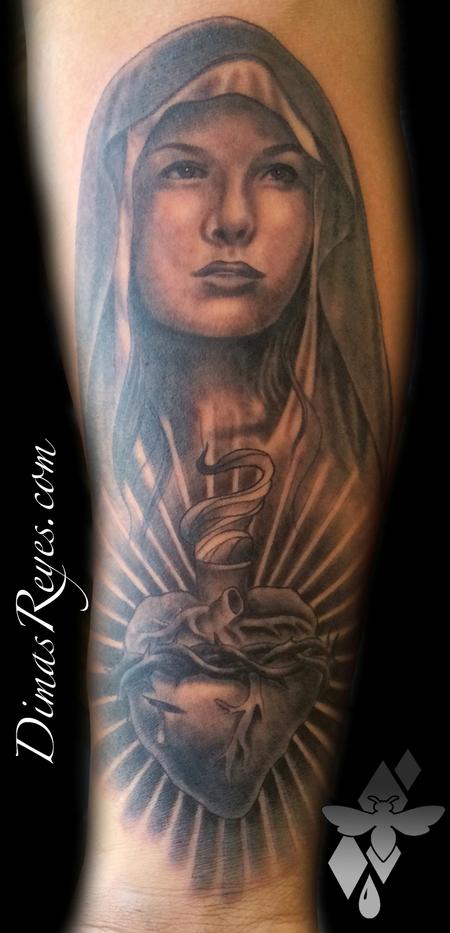 Dimas Reyes - Black and Grey Madonna and Sacred Heart tattoo